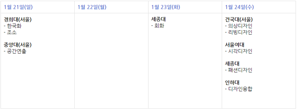 지난 11월 17일 수능시험은 끝났지만 미대를 지원하고자 하는 수험생들에게는 아직 실기 시험이 남아 있습니다. 오늘은 2024학년도 정시 지원을 위한 프로세스와 함께 수도권 주요 미대와 학과, 그리 각 미대 학과별 정시 실기 시험 일정에 대해 알아보도록 하겠습니다. 수능 성적으로만 선발하는 학교와 학과는 제외하였으니 참고해 주시기 바랍니다.