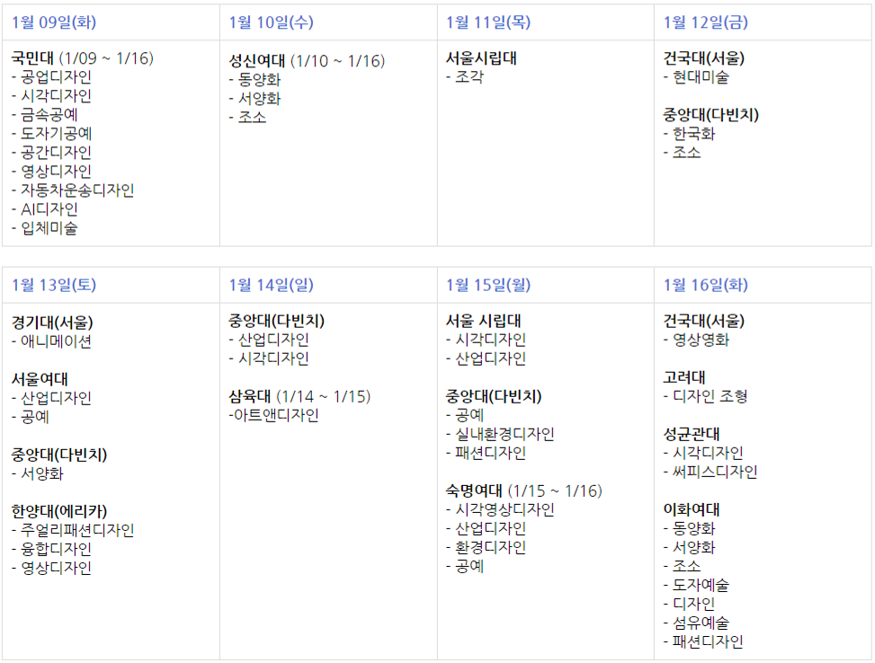 이상으로 2024학년도 수도권 주요 미대의 학과별 실기시험 일정을 알아보았습니다. 실기 시험 일정이 아직 확정되지 않은 학교와 학과도 있고 혹시나 변경될 수도 있으니 시험 전에는 각 학교 학과별로 공지사항을 잘 살펴보시는 것이 필요할 것 같습니다. 모든 수험생분들에게 좋은 결과 있기를 바라겠습니다.